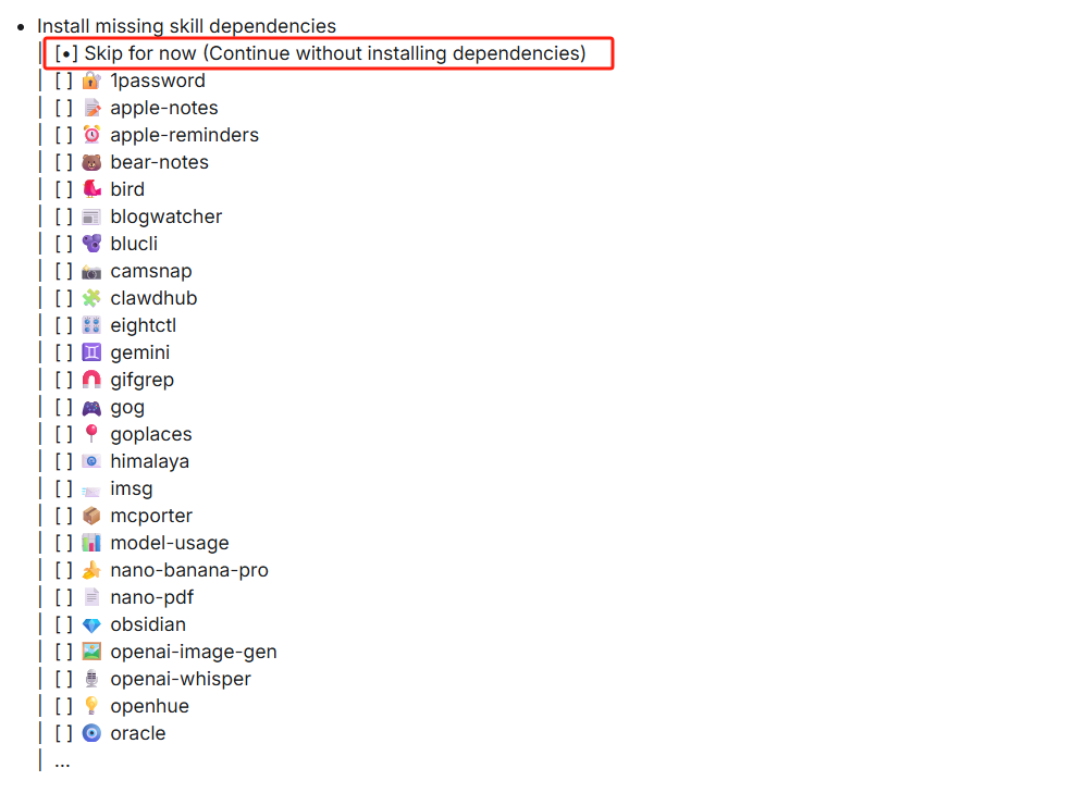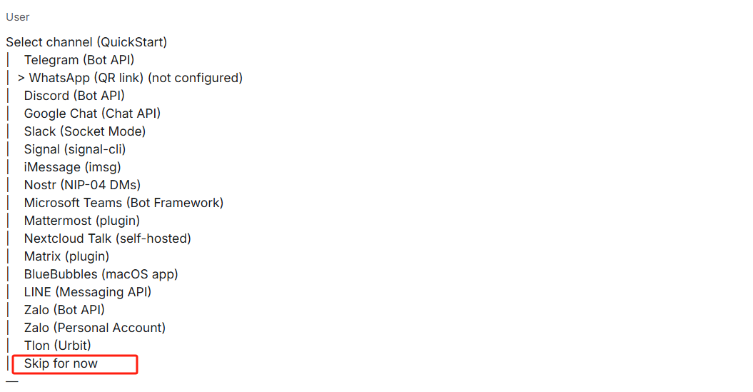 Skip for now。我们先在本地跑通,以后再连 Telegram。