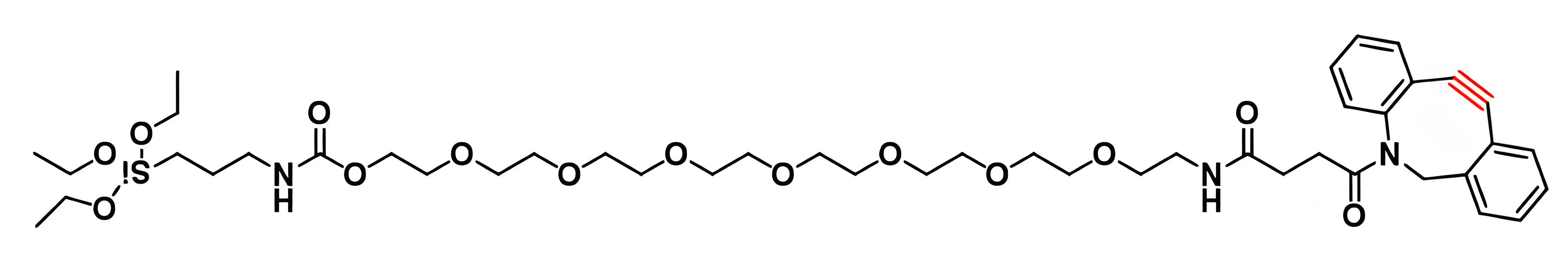 双功能协同:硅烷基团负责对接无机材料,DBCO基团实现与特定分子的高效偶联,PEG8链提供中间连接与性能优化。