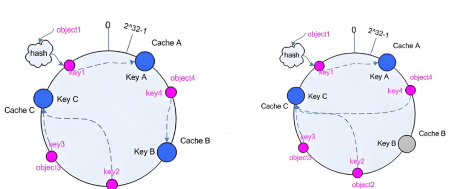 3、将keyA和key1都放在hash环上,将用户请求调度到离key1最近的keyA对应的后端服务器