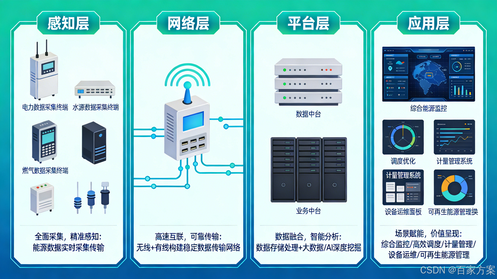 采用****"感知层---网络层---平台层---应用层"****四层技术架构,实现从数据采集到价值创造的闭环。