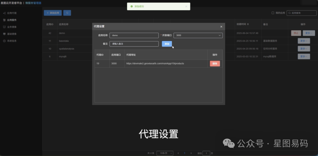 安全代理与访问:微服务管理器提供关键的应用代理能力。它将托管在平台内的服务,动态代理到星图云的公网域名(https://devmate2.geovisearth.com)下,生成唯一的、安全的访问端点(API)。这意味着,您在星图云开发者平台内开发的前端应用、业务逻辑,可以通过标准的Web API(如HTTP)方式,即时、安全地调用这些托管的自有服务。