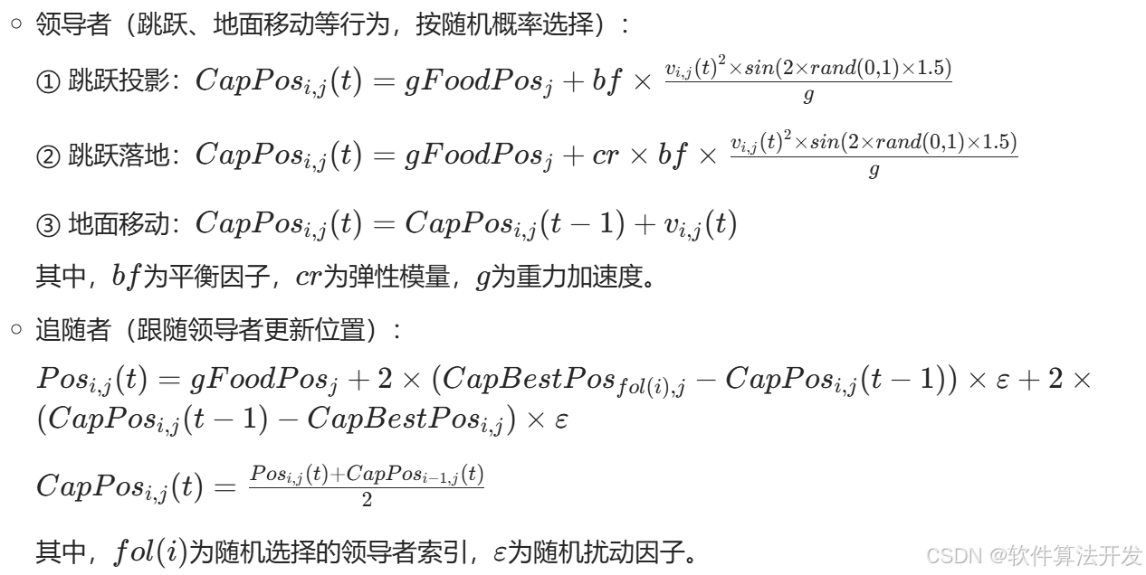 位置更新:模拟卷尾猴的5种行为,分领导者(前Npop/2个个体)与追随者(后Npop/2个个体)分别更新,核心公式如下: