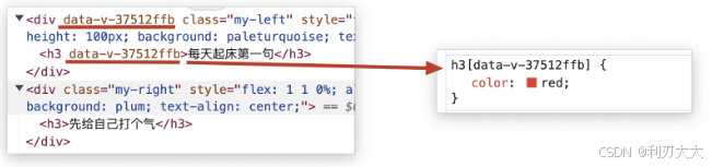 至此,发现 MyRight.vue 中 h3 的样式受到了的影响。为了解决样式污染/冲突问题,可以给组件的 style 添加 scoped 属性,这样就避免了不同组件之前样式污染的问题。