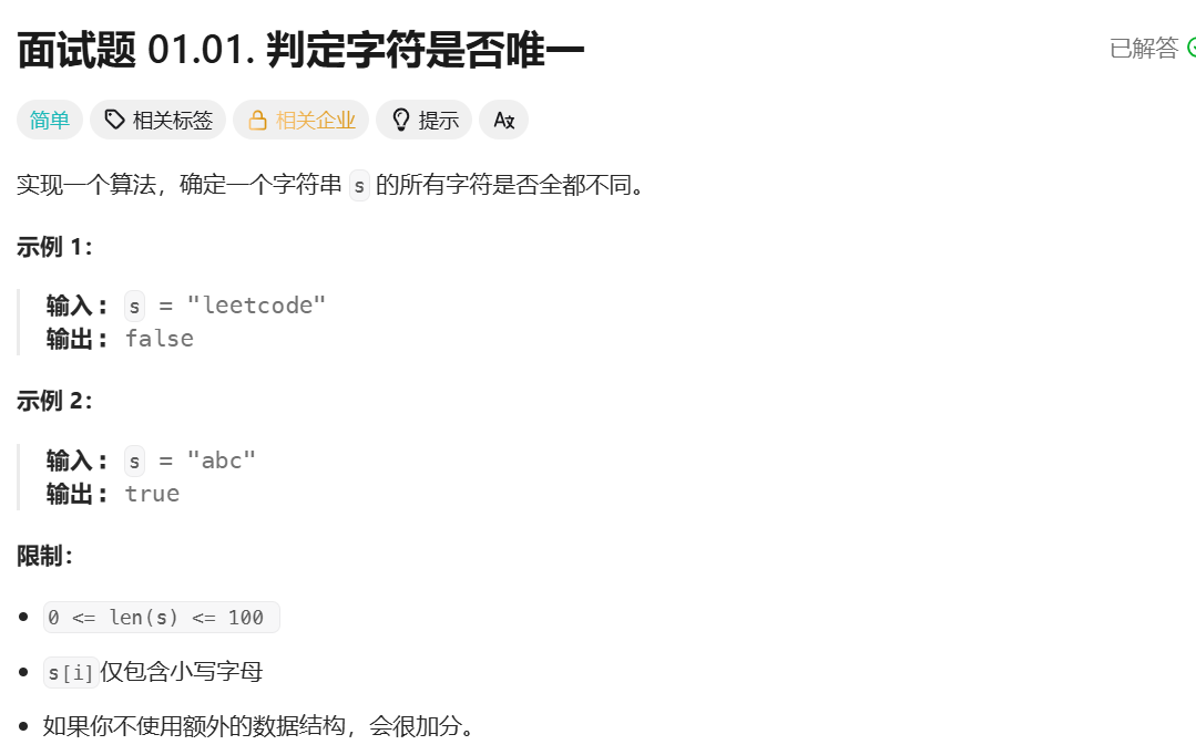 **思路:**这道题可以使用一些容器进行字符和该字符出现次数的映射,就可以解决问题(哈希表,数组都可以),但是如果不想使用额外的数据结构,可以使用位图,一个 int 类型的数据有 32 个bit位,该题字符串中只有小写字母(26)个,一个 int 类型的变量充当位图就够用了。每个字符映射一个 bit 位,遍历字符串,当前字符对应 bit 位是 0,说明之前没出现过,将其置 1,如果是 1,说明前面出现过,返回 false。