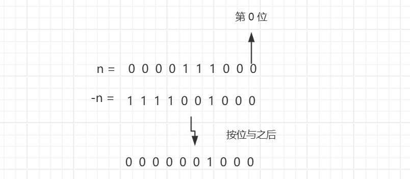 要达到上面效果,只需要 n & -n。因为 -n 的补码是 n 补码取反之后再加 1,效果就是将 n 的二进制表示中最右侧的 1 的左边的区域全都变成相反。如图所示: