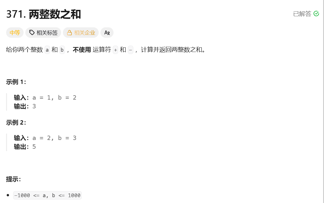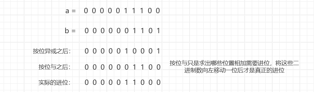 **思路:**先将两数按位异或,得到的是他们的二进制位无进位相加的结果,然后再将两个数按位与,得到需要进位的数,将这个进位的数左移一位,得到进位,不断循环这个过程,直到进位为 0,此时异或的出来的那个数就是结果。具体如图: