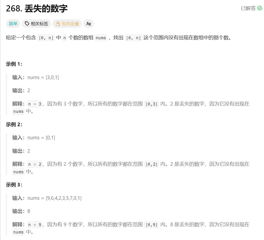 **按位异或:**将数组中的元素与 0 到 n 这 n + 1 个数进行按位异或,因为相同数字按位异或后结果为 0,任何数和 0 异或都等于这个数本身,所以按位异或后的数就是丢失的那个数字