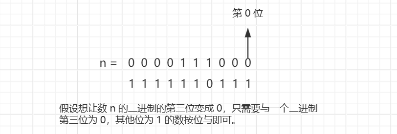 与 n 按位与的这个数字只需要将 1 左移 x 位然后按位取反即可得到。即 n = n & ( ~( 1 << x ) )
