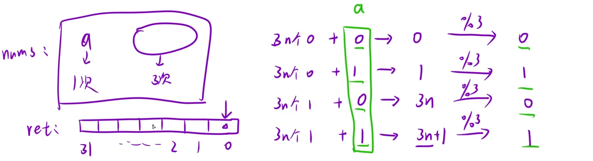 所以判断出现一次的那个数的某一个比特位是 0 还是 1,只需要把数组中所有元素的这个比特位的值相加,然后取模 3,如果是 0,出现一次的那个数的这个比特位就是 0,如果是1,出现一次的那个数的这个比特位就是1,通过这种方式,把 32 个比特位的值都算出来即可。