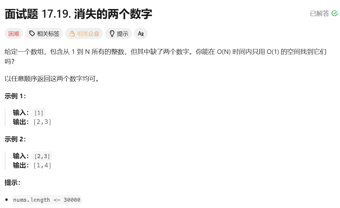 - 将数组中所有的数异或在一起,然后再和 1~N 异或在一起,这样数组中的数因为异或了两次,都等于 0,最终异或的结果其实就是消失的那两个数异或在一起了(假设将这个数存在变量 tmp 中,消失的数一个是 a,一个是 b)。
