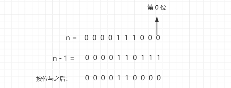 要达到上面效果,只需要 n & ( n - 1 ),n - 1 的作用是将最右侧的 1 右边的区域(包含这个 1)全部变成相反。如图所示: