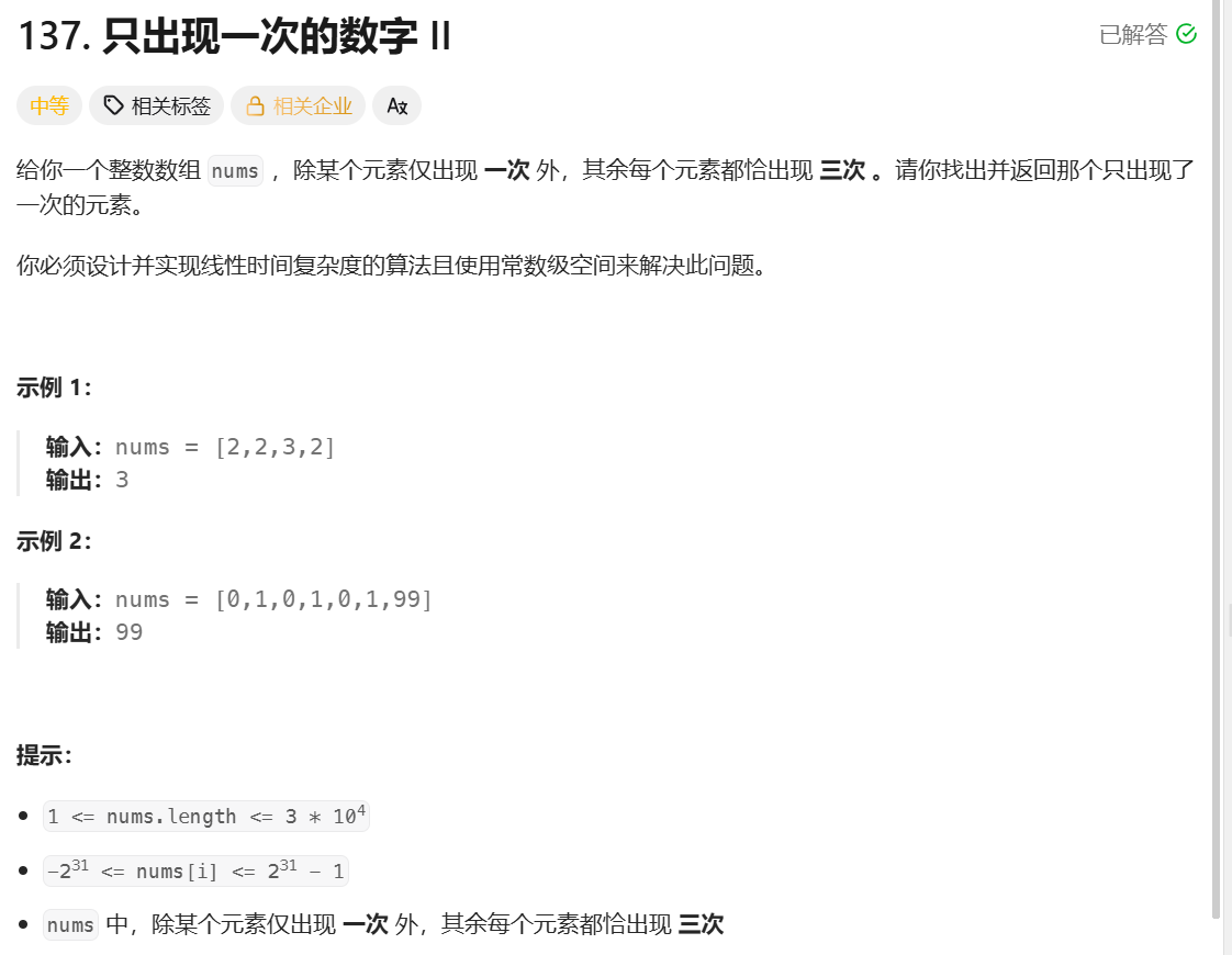 [只出现一次的数字 II](#只出现一次的数字 II)