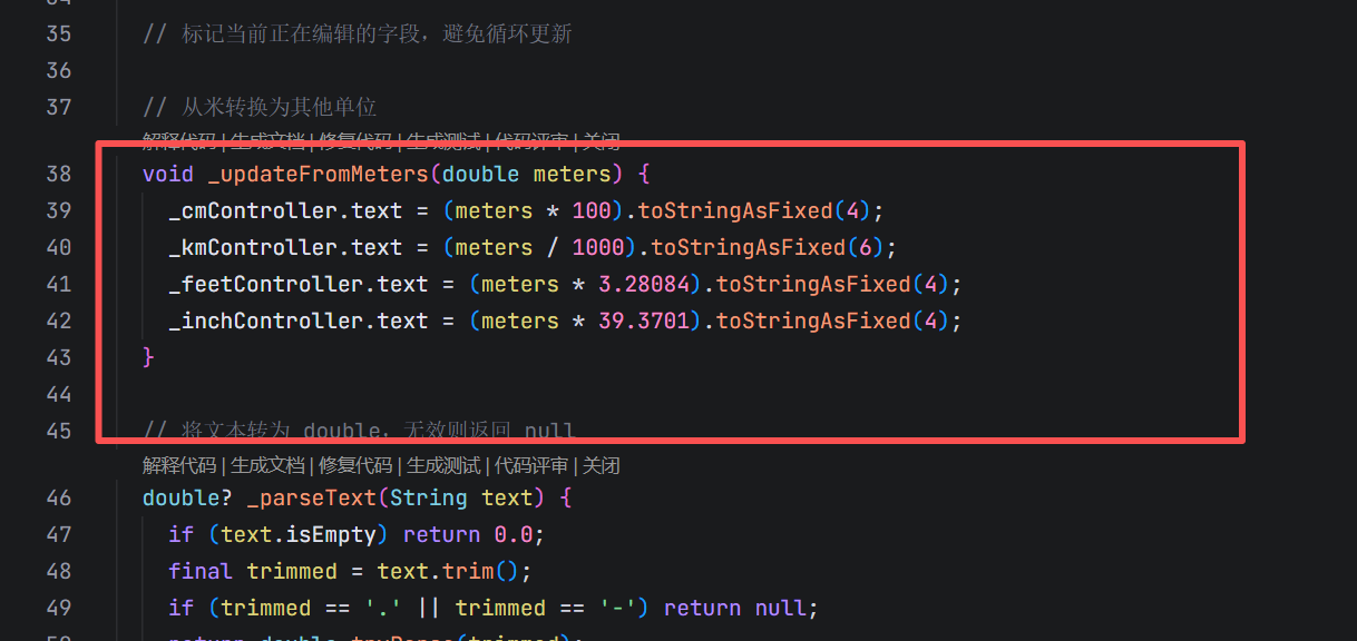_updateFromMeters,而非字段间互相监听 - 精度可控:中间计算始终基于"米",减少多次转换的浮点误差