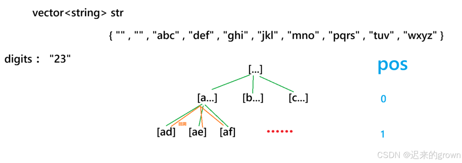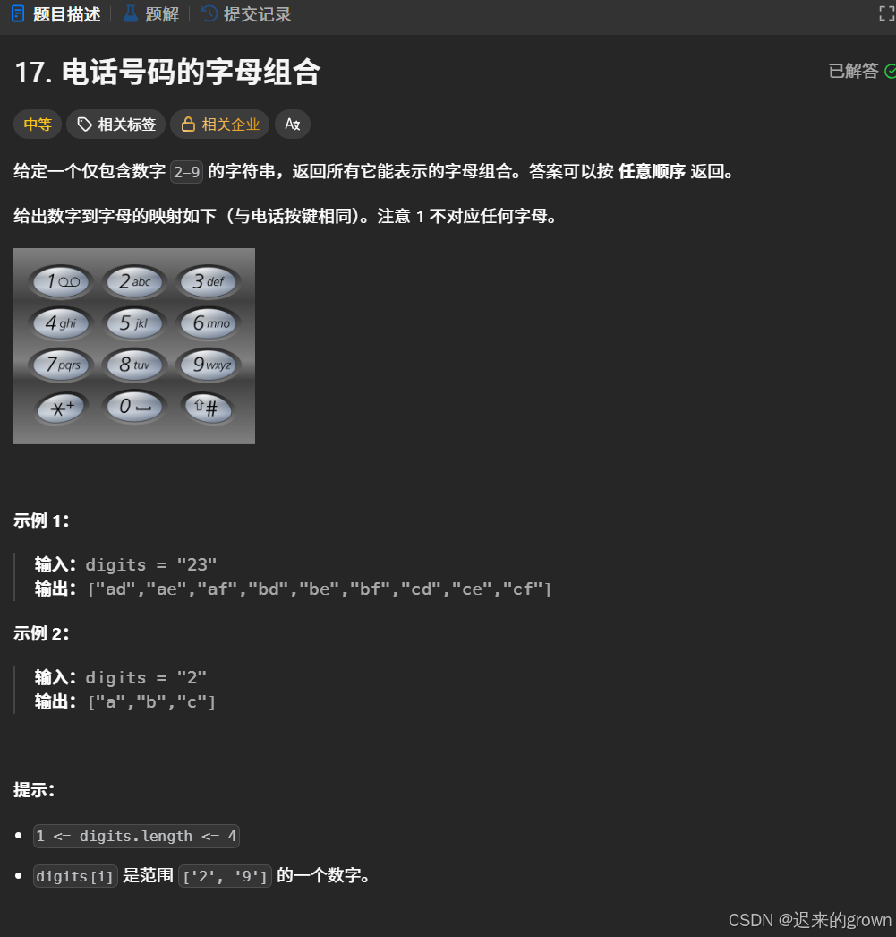 数字2-9分别对应一些字符串,例如2对应abc、3对应def;当按下数字23时,可能出现的字母组合就有ad、ae、af、bd、be、bf、cd、ce、cf等。