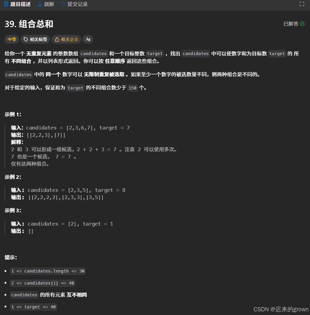 这道题给定一个candidates数组,其中所有元素互不相同,且2 <= candidates[i] <=40;以及一个目标整数target