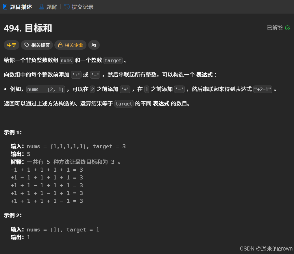 给定一个非负整数数组nums和一个整数target,要求给每一个nums中的元素加上符号(+或-),找出最终和为tarhet的不同表达式的数目。
