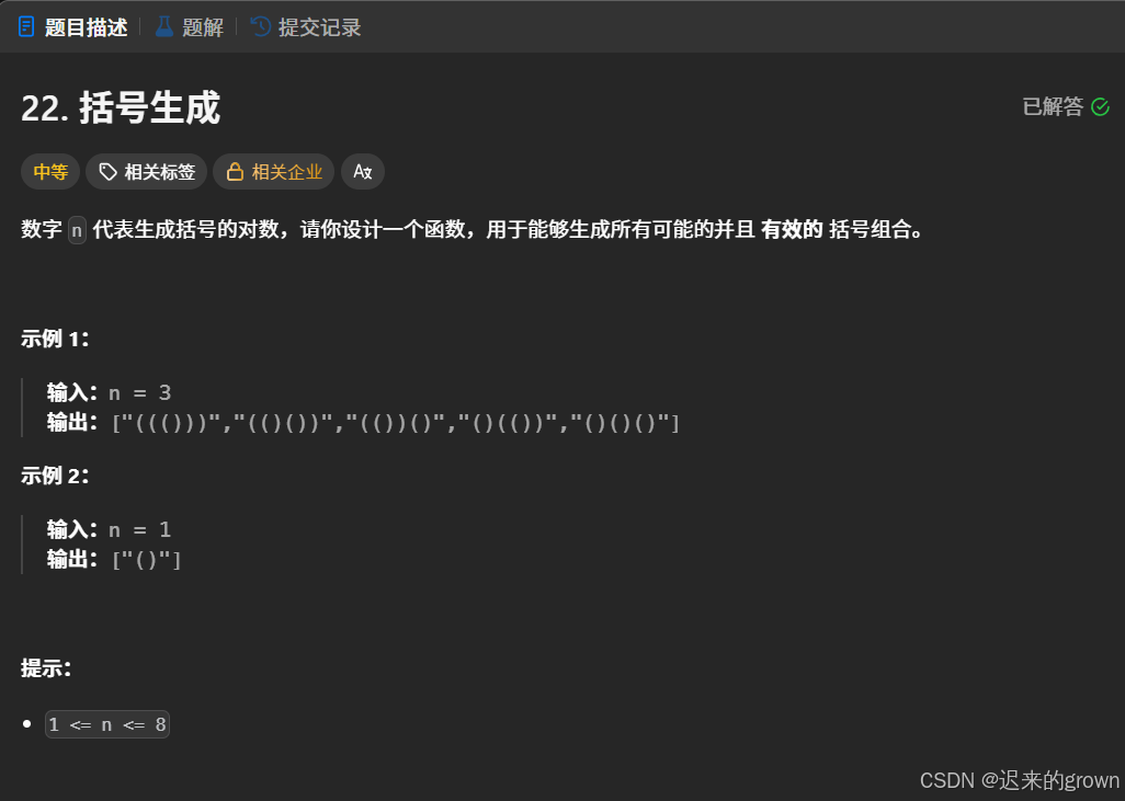 这道题给定一个n,我们要找出所有可能的并且有效的n组括号的组合。(括号有效:)前一定有(与其一一对应------)