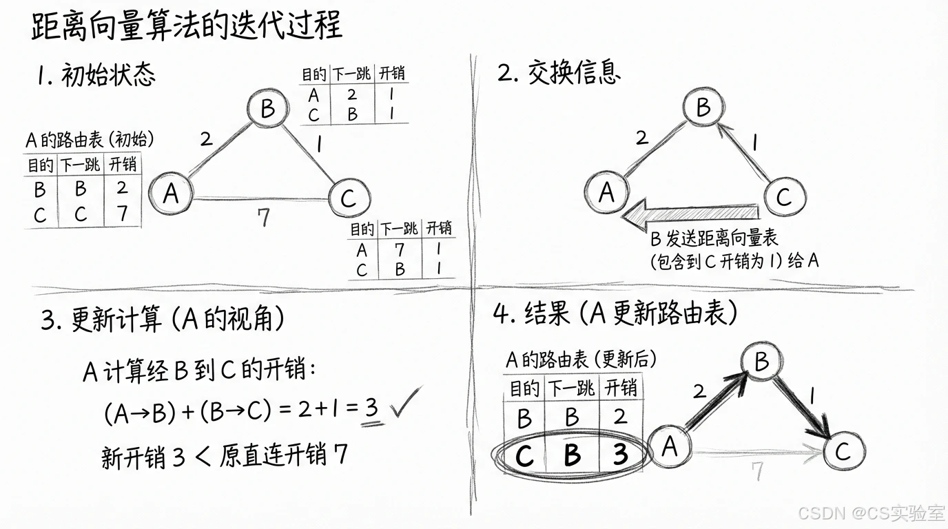 DV算法采用局部视野。节点不需要知道整个网络拓扑,只知道它的邻居是谁,以及到邻居的开销。最典型的实现是 RIP (Routing Information Protocol)。