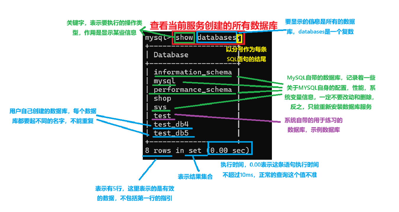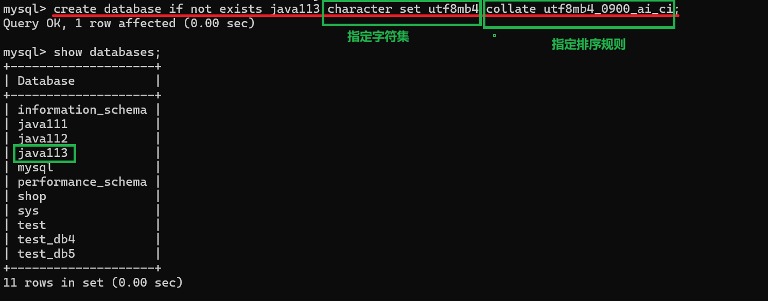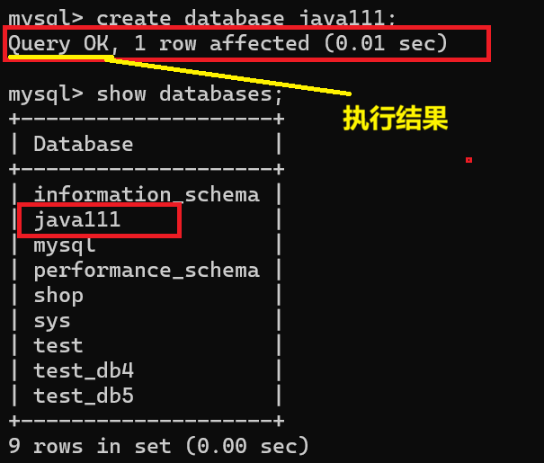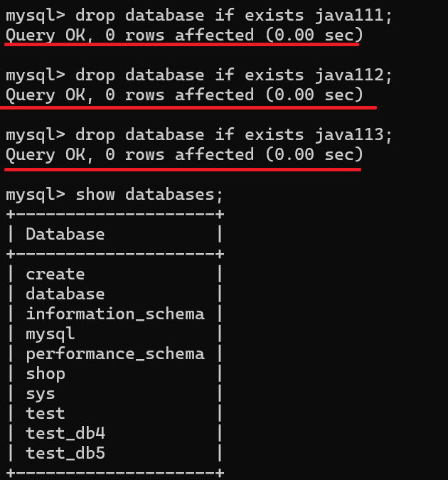 通过上面的图片,我们可以看到,我将原来创建的java111,java112,java113这三个库都删除了,然后再通过show databases;命令去查看数据库的时候,已经没有这三个库了
