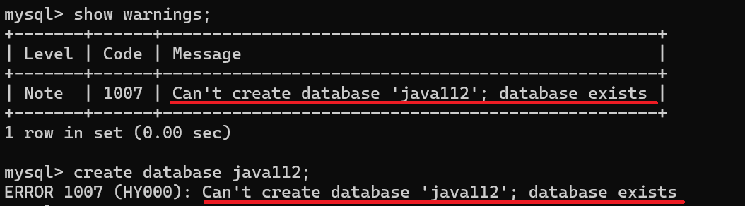 当我们在已经创建好了java112数据库的情况下,再直接创建java112,则会直接报错