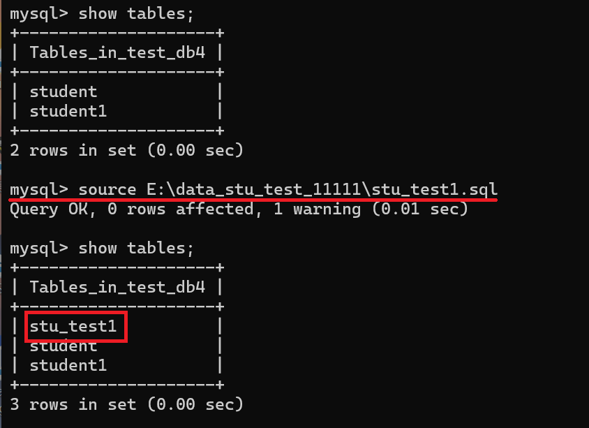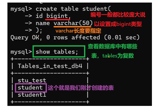 例如,我要在test_db4中创建表,我们首先要在使用test_db4这个数据库