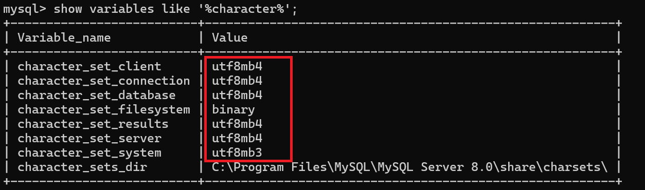 使用**show variables like '%character%';**命令