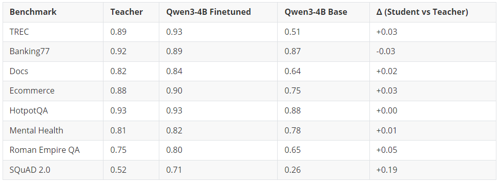 经过微调的 4B 学生模型在 6 项基准测试上超越了 120B+ 参数的教师模型,在 1 项(HotpotQA)上持平,仅在 1 项(Banking77)上略微落后(差距在误差范围内)。提升最显著的是 SQuAD 2.0 闭卷问答任务,学生模型比教师模型高出 19 个百分点 ------ 这充分证明,微调比单纯依赖提示词(prompting)能更有效地将领域知识注入模型。