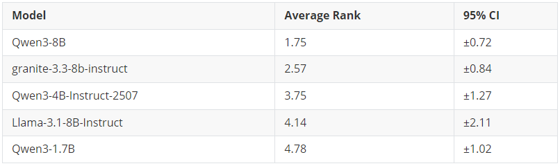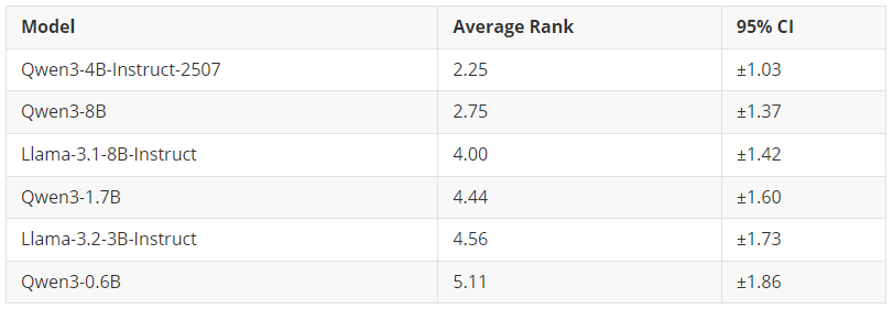 Qwen3 系列占据了排行榜前列,其中 Qwen3-4B-Instruct-2507 摘得桂冠。值得注意的是,这款 4B 模型的表现甚至超过了更大的 Qwen3-8B,这表明在蒸馏任务中,Qwen3 的较新版本(2025 年 7 月 25 日更新的版本)比之前的 8B SLM 效果更好。