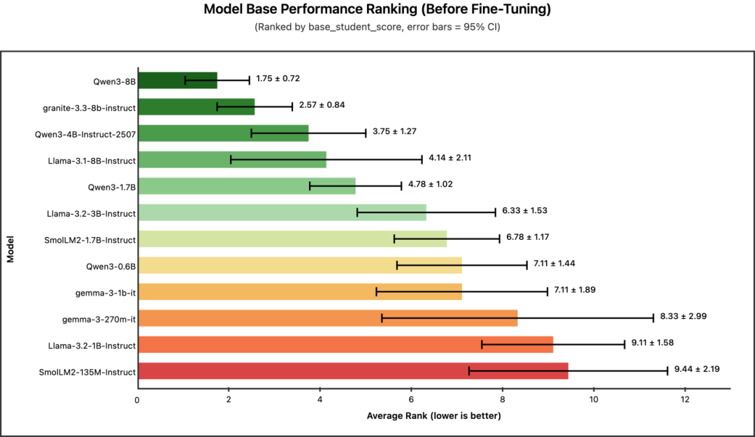 并非所有小型模型的性能都差不多,但经过微调后,它们之间的差距会大幅缩小。我们的基准测试表明,Qwen3-4B-Instruct-2507 在整体微调性能上表现最佳,不仅能媲美 120B+ 参数的教师模型,还能在单块消费级 GPU 上部署运行。在资源极度受限的环境中,像 Llama-3.2-1B 这样的小模型展现出卓越的可微调性,能够大幅缩小与大模型的性能差距。