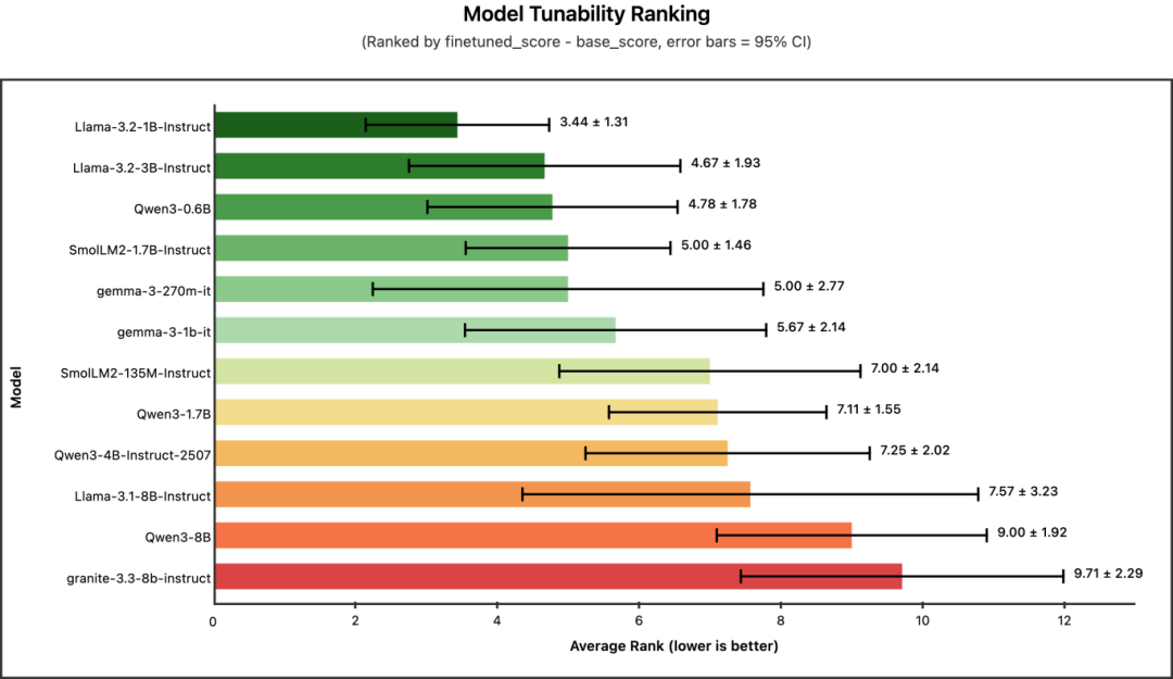 有趣的是,可微调性排名与模型大小的排序正好相反。像 Llama-3.2-1B 和 Qwen3-0.6B 这样的小型模型,从微调中获得的提升最大。而规模最大的模型(如 Qwen3-8B、granite-3.3-8b)在可微调性排名中接近垫底 ------ 这并非因为它们表现差,而是因为它们起点相对较高,进步空间相对有限。
