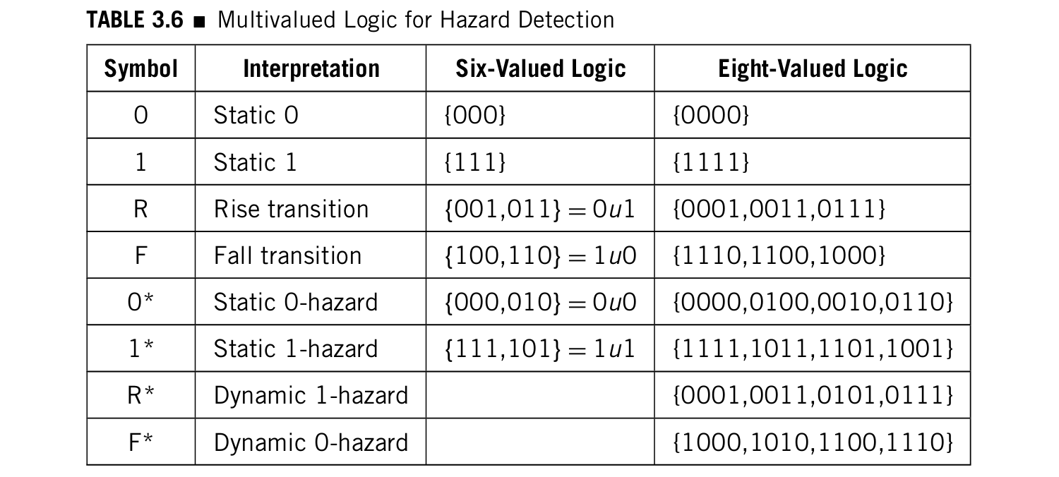 dynamic hazard是在0-to-1或者1-to-0转换过程中发生的不想发生的状态,为了去检测dynamic hazard,要用到eight-valued logic(4比特),它的标志和解释如表3.6。