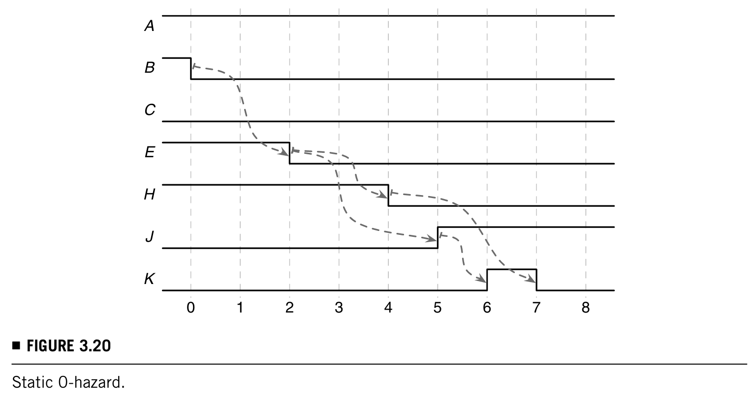 输入向量ABC从110变为100,反相器的nominal delay是3 ns,其他门的nominal delays是2 ns,本来输出K是应该保持0不变的,但是因为延迟,仿真就会出现一个假脉冲,这种叫static 0-hazard。