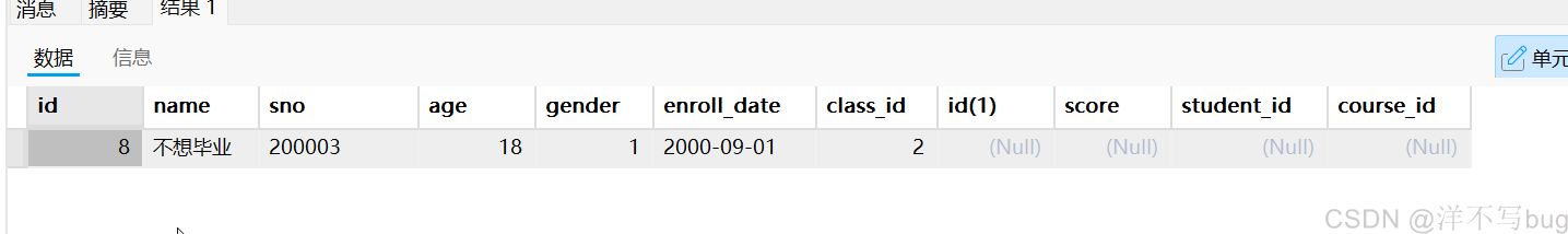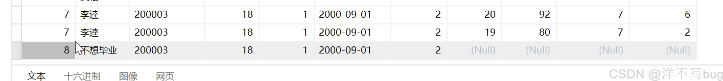 在student表中插入一个id为8,名字为不想毕业的学生,这个学生所有考试都没有参加😅