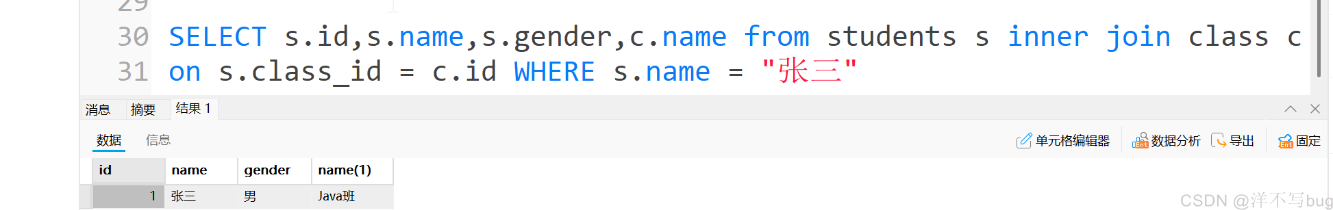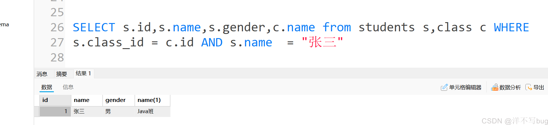 在联合查询中Where过滤数据时,还可以搭配AND,进一步进行精准查询(如下图),查询张三的班级信息: