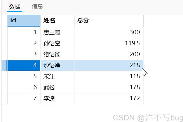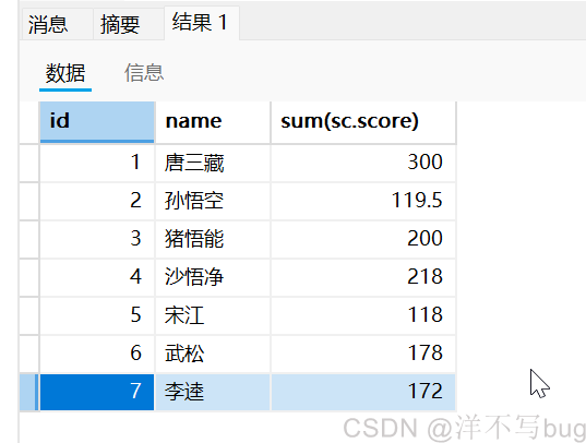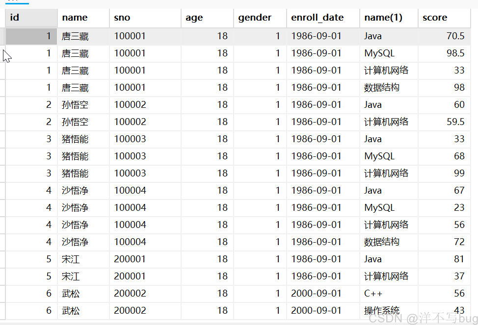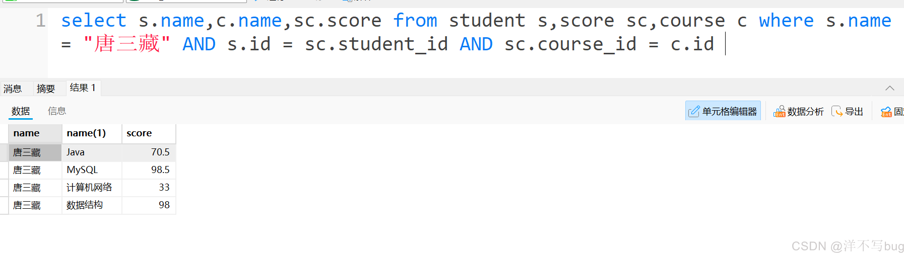 无效数据筛选:这里有两个筛选条件,一个是名字是唐三藏,一个是student表中的id和score表中的student_id必须相等