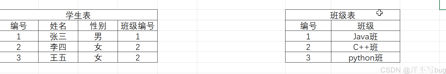 如果想要得到一张学生表和班级表的整合,同时又没有班级编号(如下图),这就要用到联合查询(这里的联合指的是多个表的组合)