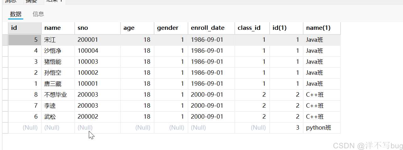 以左连接为例,就以student表作为基准表,student的所有信息全部显示,score表没有对应的记录,列中的数据就是null