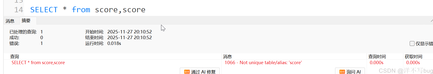 自己对自己取笛卡尔积,这里就会报错(如下图),报错的原因是:表 / 别名不唯一
