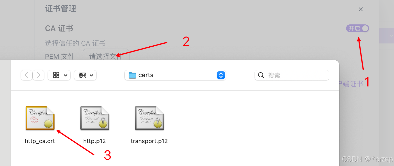 打开证书开关、选择文件、选择证书