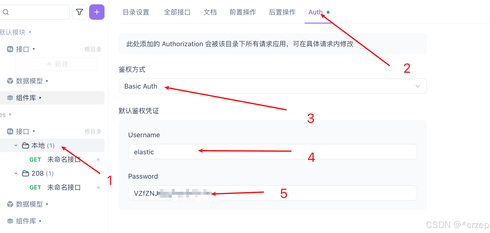 点击目录/模块、选择认证/Auth、选择鉴权方式、输入帐户密码elastic/passwd