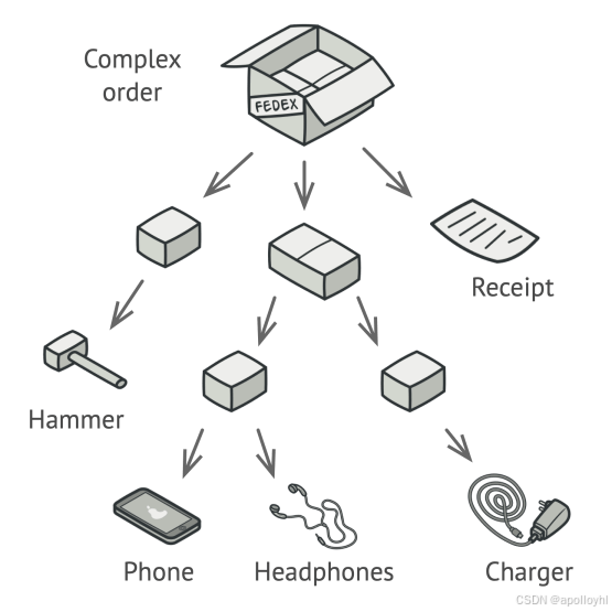 这种方法会如何工作?对于产品,它会直接返回产品的价格。对于盒子,它会逐一查看盒子里的每个物品,询问价格,然后返回该盒子的总价。如果其中一个盒子较小,盒子也会开始查看其内容物,依此类推,直到计算出所有内部组件的价格。盒子甚至可能在最终价格中增加一些额外成本,比如包装成本。