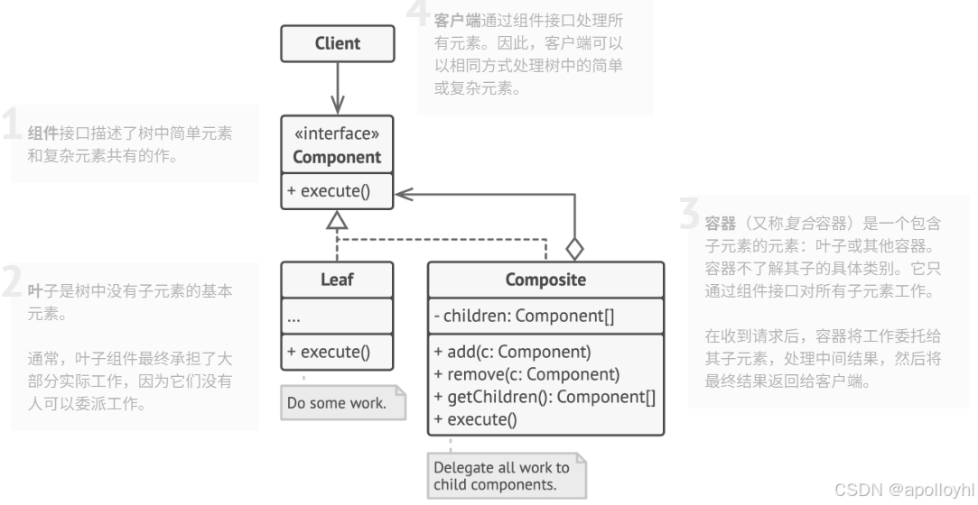 请记住,这些作可以在组件接口中声明。这会违反接口隔离原则,因为叶类中的方法将是空的。然而,客户即使在构建树时,也能一视同仁地对待所有元素。