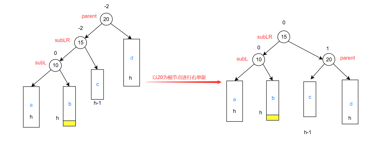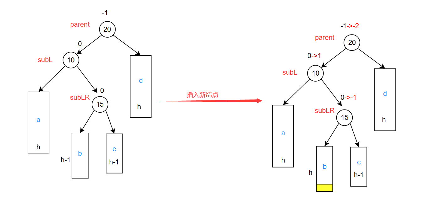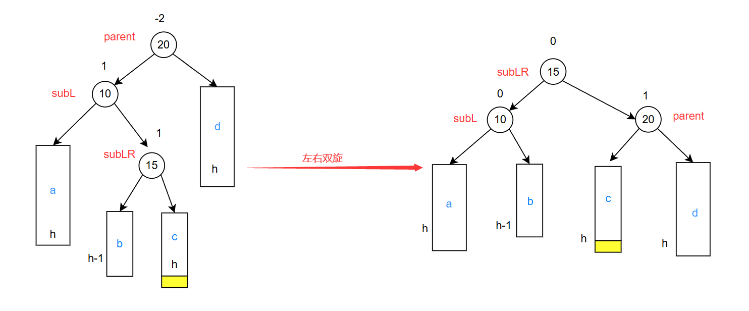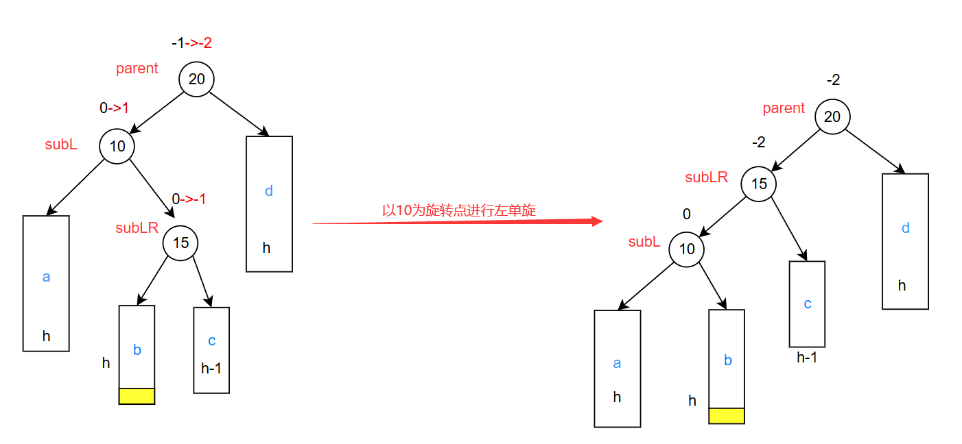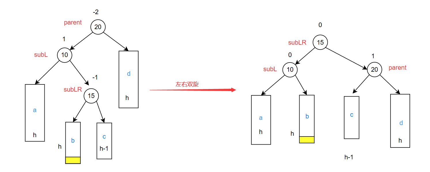 1、当subLR原始平衡因子是-1时,左右双旋后parent、subL、subLR的平衡因子分别更新为1、0、0。