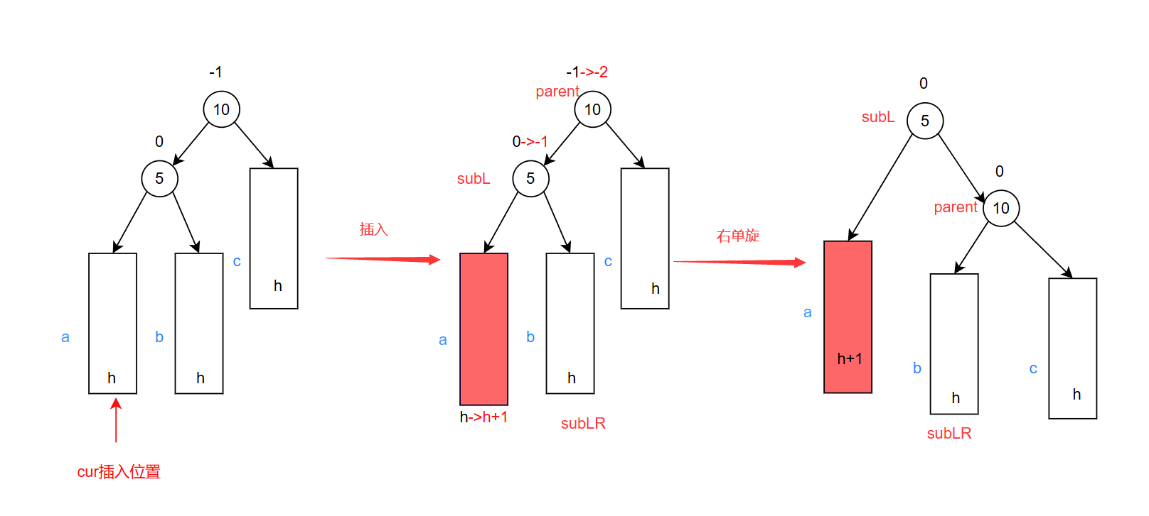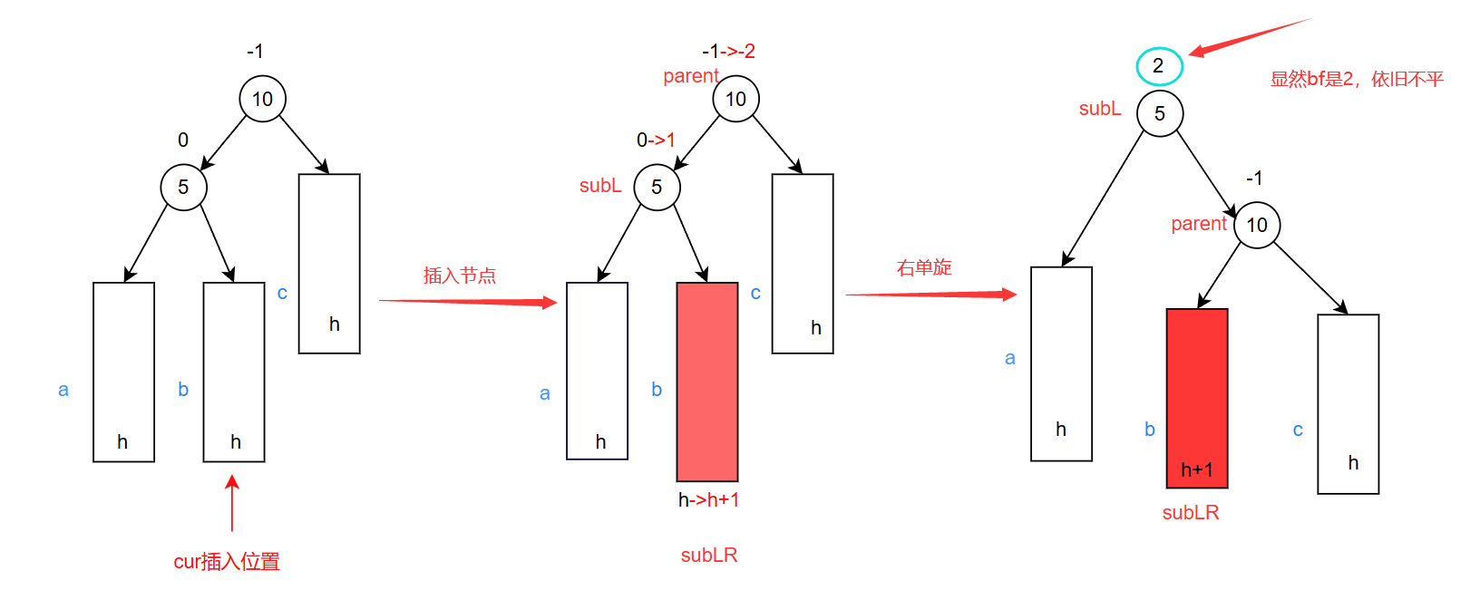 旋转过程:将节点10标记为parent,5为subL,b为subLR,将parent的左指针指向subLR,subL的右指针指向parent,subL成为新的根。旋转完成后,subL和parent的平衡因子都置为0。