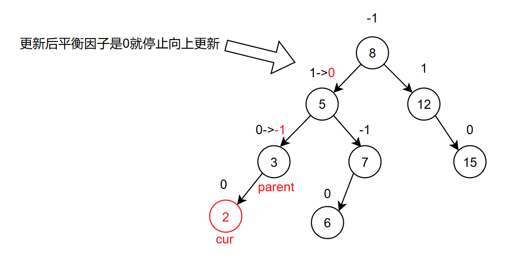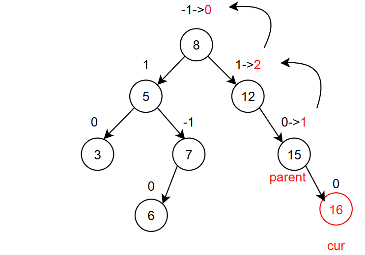 - 当 cur 是 parent 的右孩子,则 parent 的平衡因子 + 1。