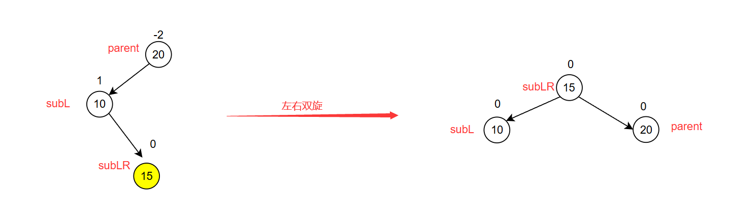 2、当subLR原始平衡因子是1 时,左右双旋后parent、subL、subLR的平衡因子分别更新为0、-1、0。