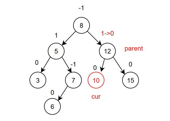 - 当 cur 是 parent 的左孩子,则 parent 的平衡因子 - 1;
