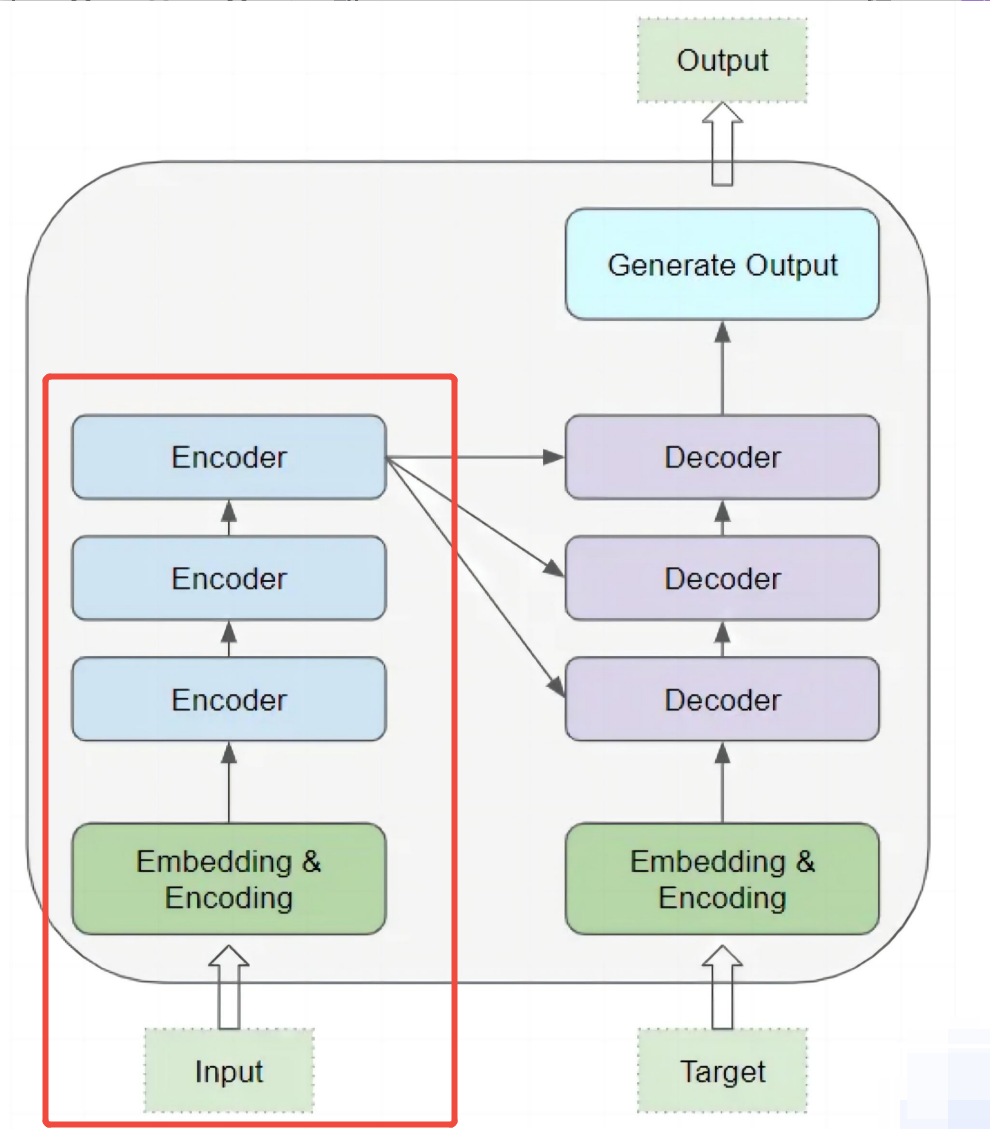 - Embedding & Encoding:作用和编码器堆栈的嵌入层相同,都是将人能理解的语言符号,转变成模型能理解的矩阵
