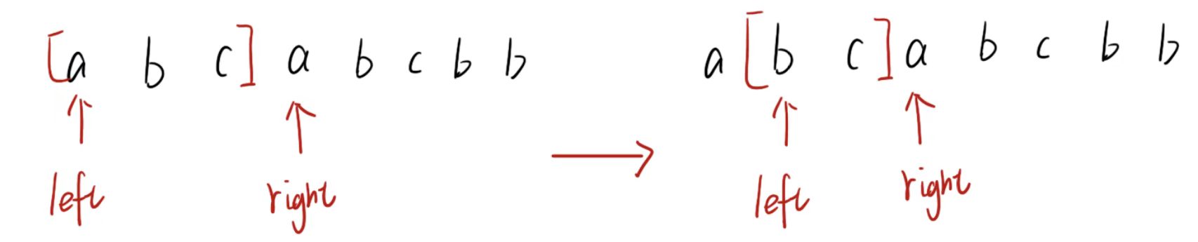- 固定左端点,右端点逐步向右移动,窗口每添加一个字符,则加入到