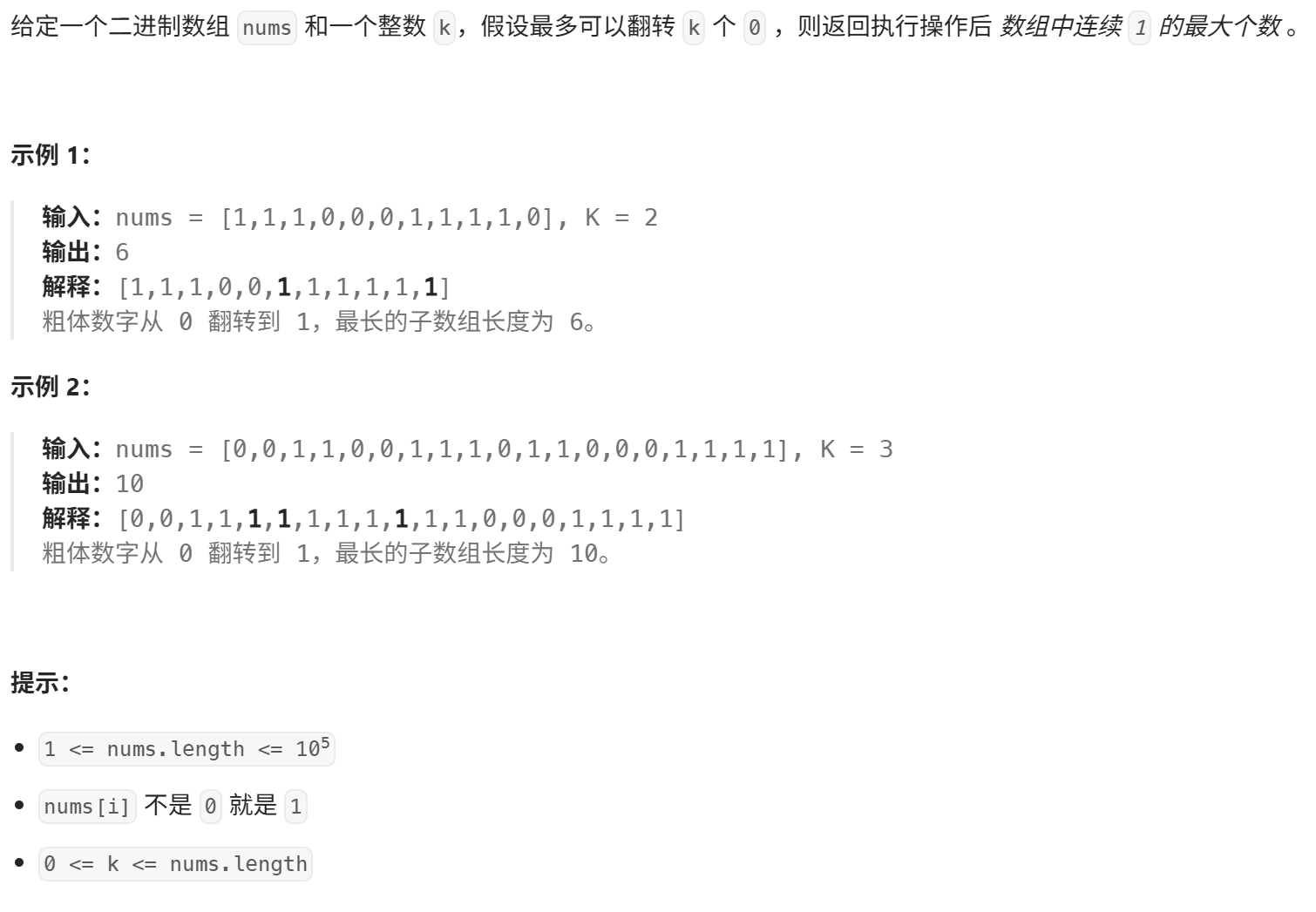 鉴于题目没有要求翻转0,翻转0的操作比较复杂,这道题的要求可以转换为在给定的数组找到最长子数组,并且保证子数组中0的个数不超过K个。